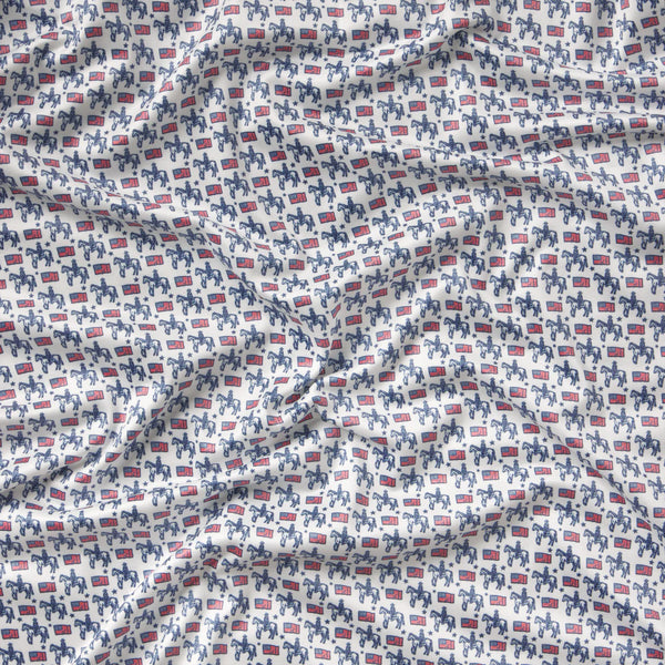 Our Flyline Performance Polo - The American West features a unique micro print of the American flag and a cowboy on horseback, perfect for adding some rodeo-inspired style to your wardrobe. Crafted from stretchy, moisture-wicking fabric, it keeps you cool and comfortable during outdoor activities and is ideal for staying active while showcasing your rugged, patriotic spirit.