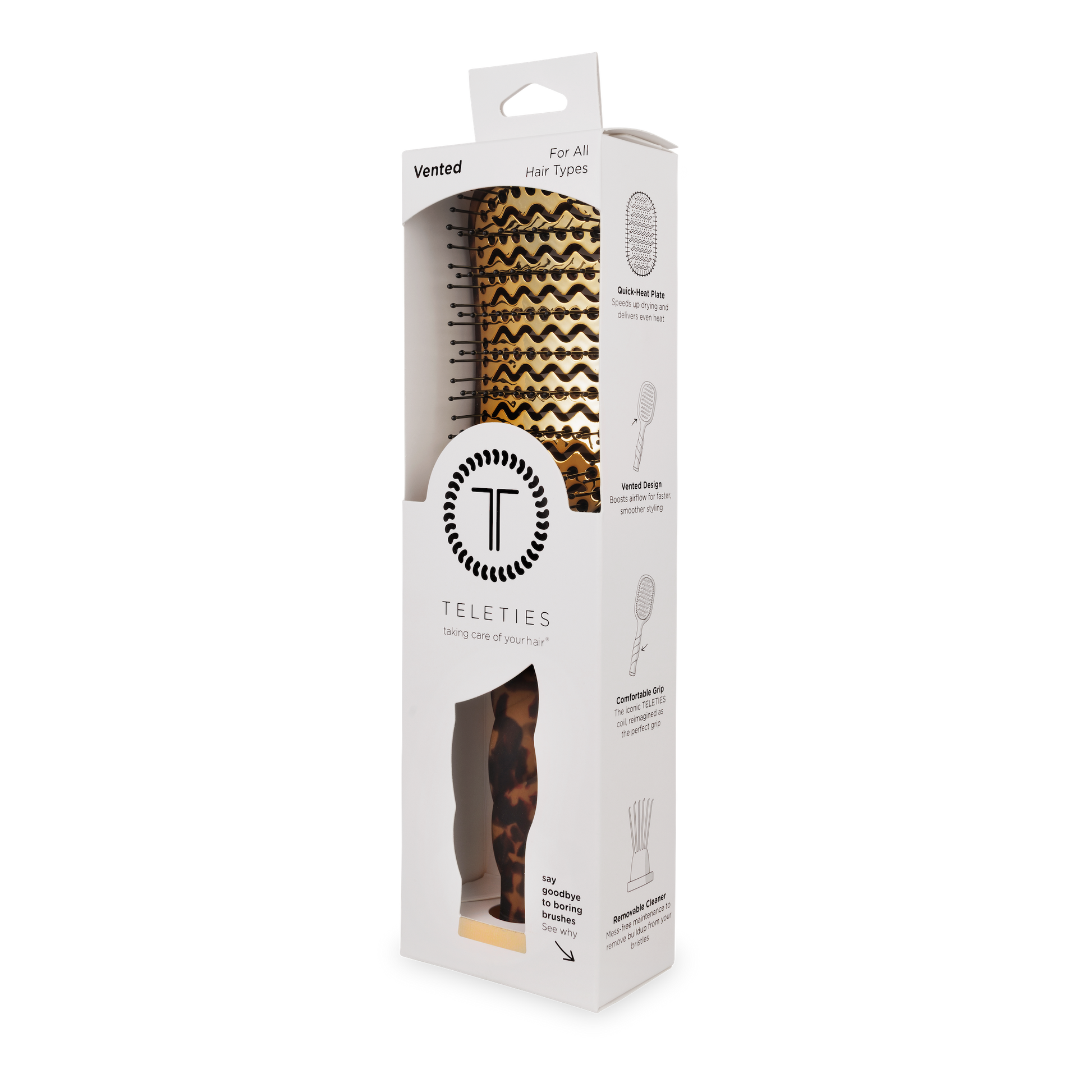 The Vented Brush in Tortoise is your new secret to faster, smoother blowouts. Pairing a Quick-Heat Aluminum Plate that heats up in seconds and distributes heat evenly with a vented design to enhance air flow, this vent brush works perfectly with your blow dryer to cut down on styling time without cutting corners on results.